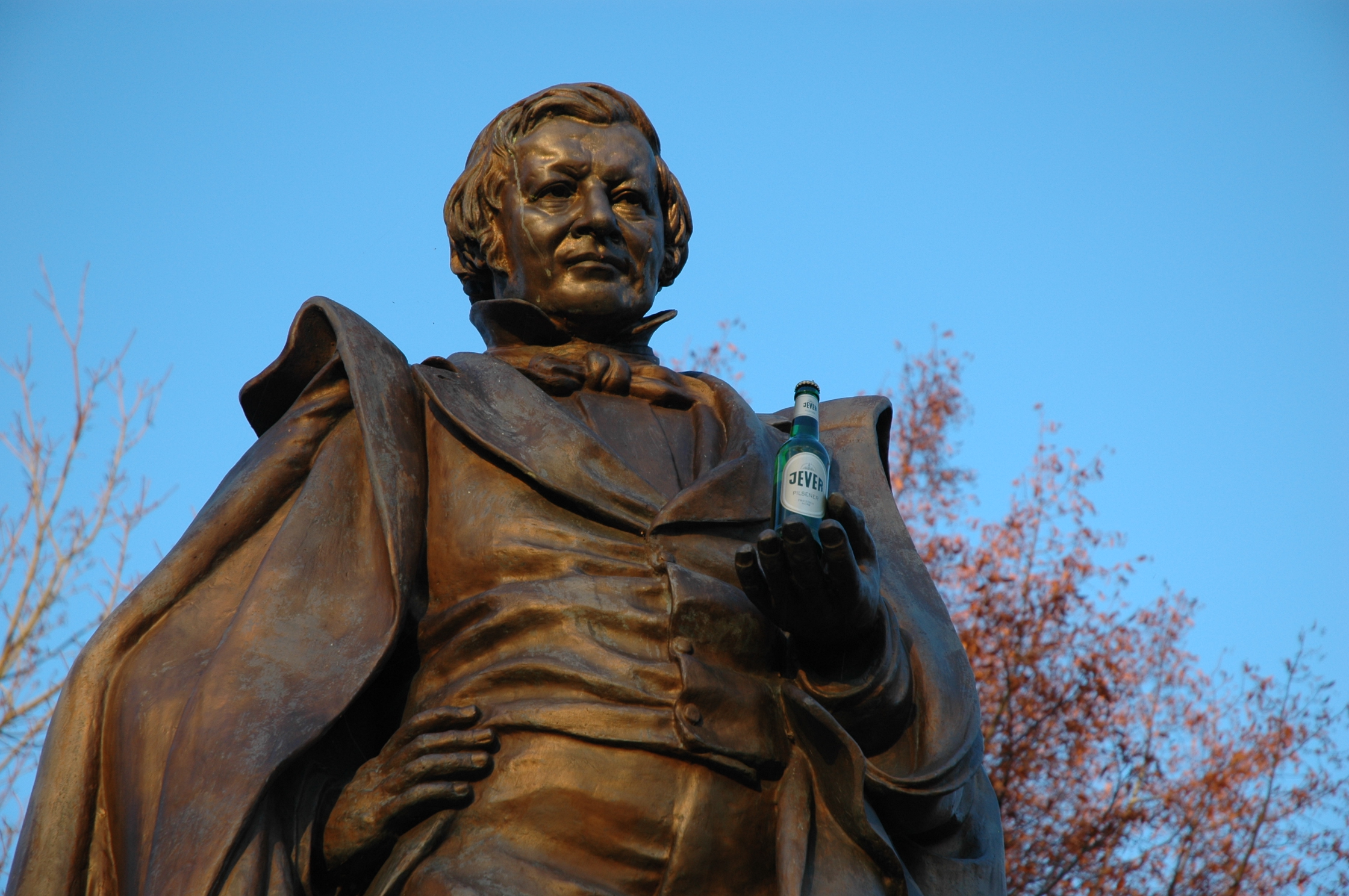 Stolz blickt er, ein wenig von oben herab, hat auch allen Grund dazu: Eilhard Mitscherlich, berühmter Sohn des Jeverlandes, Chemiker und Mineraloge. Er verstand was von der Zusammensetzung der Dinge. Auch von Gerste, Hopfen, Hefe und Wasser, jener Mixtur, aus der köstliches Bier entsteht. Ob er aber ganz freiwillig zum Werbeträger geworden ist? Irgendjemand wird wohl nachgeholfen haben. Ohne eine waghalsige Kletterpartie ging das bei dem hohen Herrn an der St.-Annen-Straße in Jever allerdings nicht.