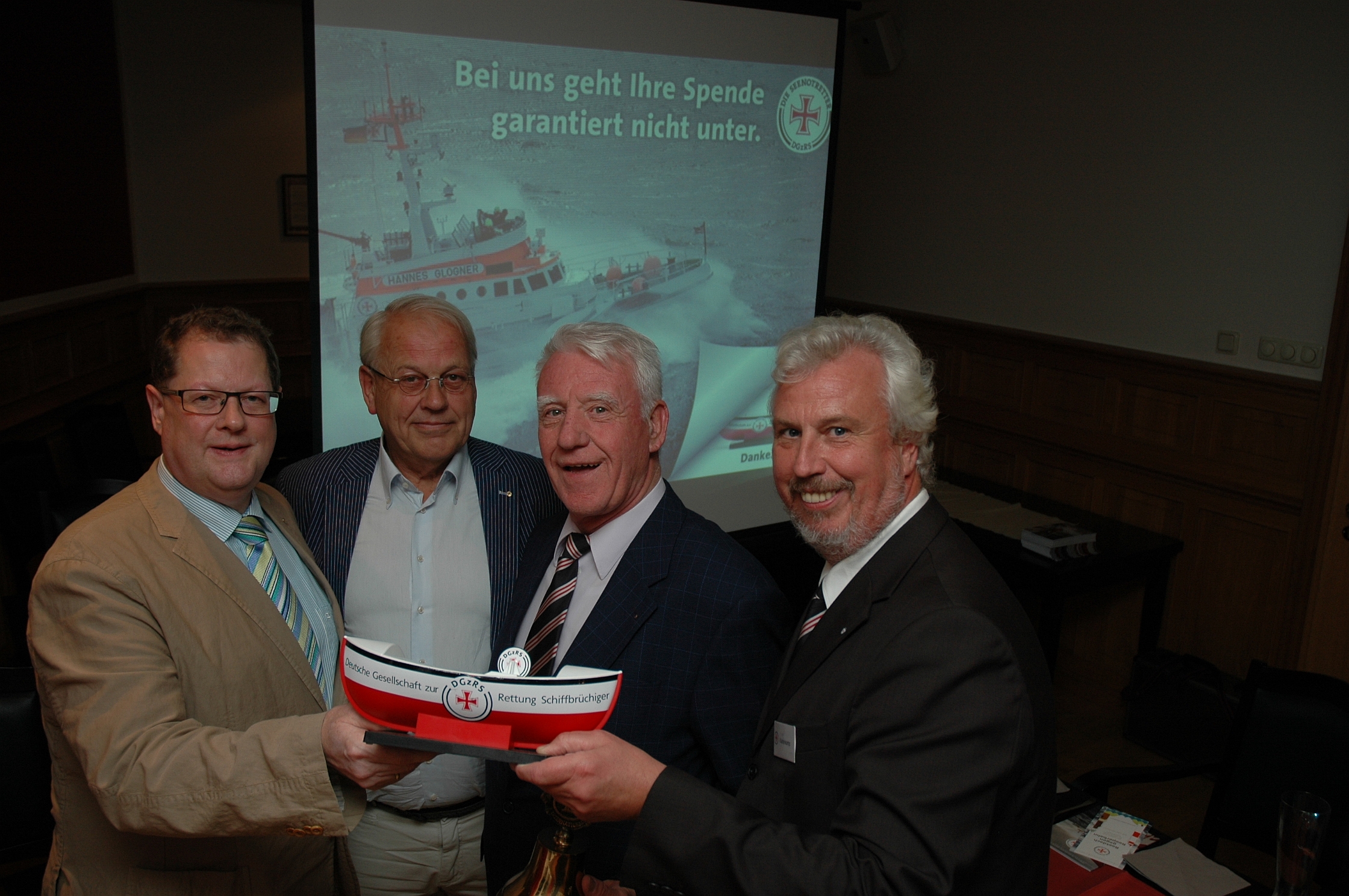 Die Lions-Präsidenten Jan Scherf (Jever) und Henk Zilverberg (Emmen) sowie der Clubbeauftragte für die DGzRS-Sammlung Udo König übergaben dem Leiter des Informationszentrums Nordwest der DGzRS, Hans-Joachim Katenkamp, eine Spende von 3250 Euro für die Arbeit der Seenotretter. Foto (c): Helmut Burlager