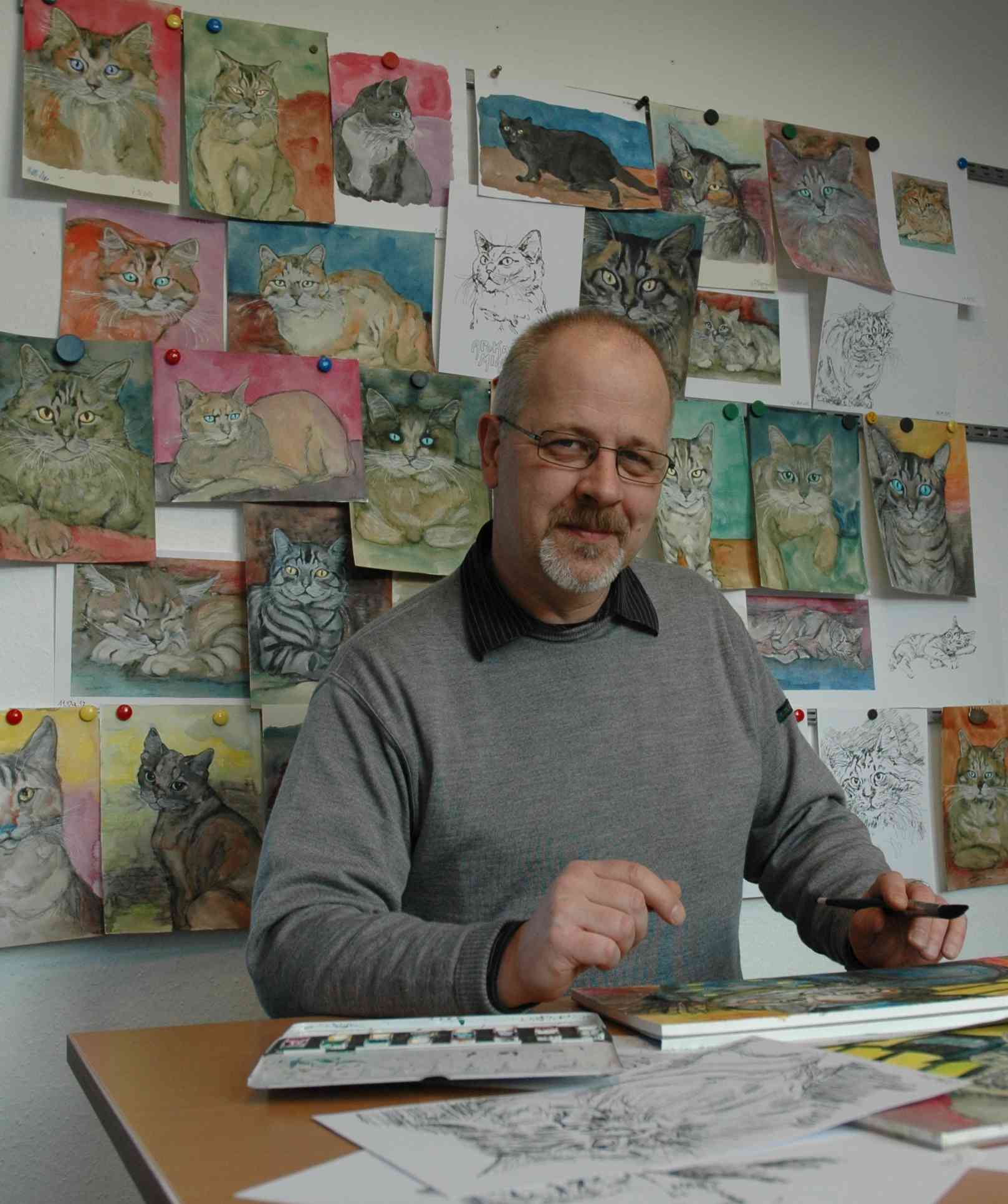 Ein bisschen verrückt muss wohl sein, wer fünf Jahre lang jeden Morgen nach dem Aufstehen erst einmal eine Katze malt. Christoph Hinz hat seinen ersten Kalender veröffentlicht. Foto (c): Cornelia Lüers