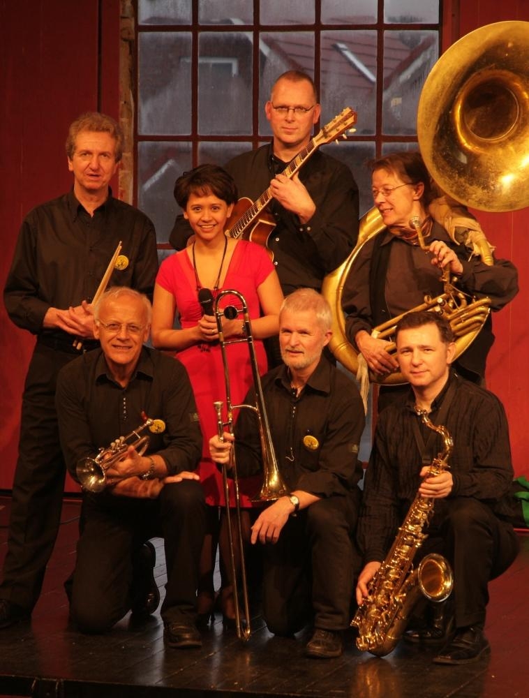 Die Rhythmusgruppe wird angeführt von Liesbeth Blauuw, die sowohl den Kontrabass als auch das Sousaphon perfekt beherrscht und von Heiner Olech am Schlagzeug, der auch gerne fröhliche Gesangsstücke einstreut. – Und natürlich ist ein besonderes Highlight der Band die großartige Sängerin Sheila Heyartz , die liebevoll auch als Spatz von Jever bezeichnet wird.