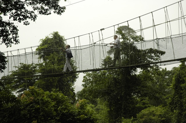 1995 ist der Baumwipfelweg im Kakum-Nationalpark in Betrieb genommen worden. Er ist nur für Besucher ohne Höhenangst geeignet, denn der Walkway ist ein System wackliger Hängebrücken; ein Spazierweg, der in gut 40 Meter Höhe auf einer Strecke von 350 Metern von Baumwipfel zu Baumwipfel führt.