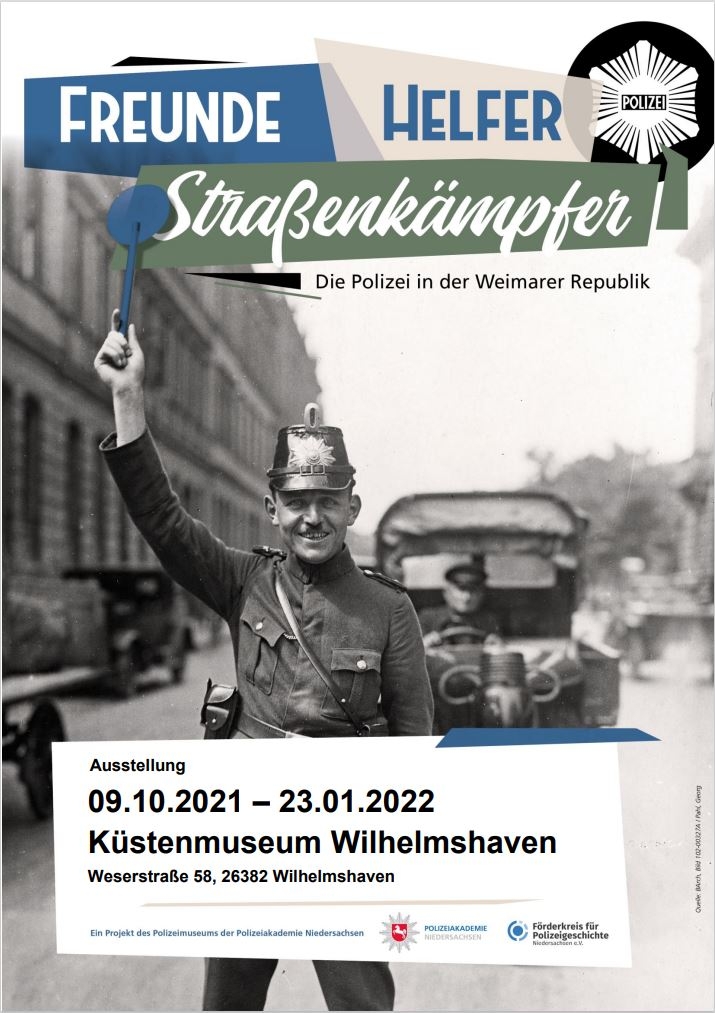 Eine hilfsbereite, bürgernahe Polizei zu sein – das Ideal galt in der Weimarer Republik (1918-1933) so wie heute. Wie schnell sich so ein Anspruch in der Wirklichkeit und im Alltag verlieren kann, zeigt die Geschichte: Blutige Straßenkämpfe zwischen politischen Gegnern zersetzen die junge Demokratie. Die Polizei wird durch die Gewalt gefordert und ist nicht selten überfordert. Das Küstenmuseum Wilhelmshaven zeigt in Zusammenarbeit mit der Polizeiinspektion Wilhelmshaven-Friesland bis zum 23. Januar die Wanderausstellung „Freunde – Helfer – Straßenkämpfer“. Sie handelt von der widersprüchlichen Geschichte der Polizei in der Weimarer Republik; Exponate aus der Sammlung des Polizeimuseums Niedersachsen laden zu einer interessanten Zeitreise ein. Anlass ist auch ein lokales Jubiläum. Vor genau 100 Jahren, 1921, entstand die „Schutzpolizei Wilhelmshaven“. Deshalb ergänzt der Förderverein für Polizeigeschichte Wilhelmshaven die Ausstellung um spannende Objekte und Anekdoten. Quelle: Pressemitteilung der Polizeiinspektion Wilhelmshaven-Friesland