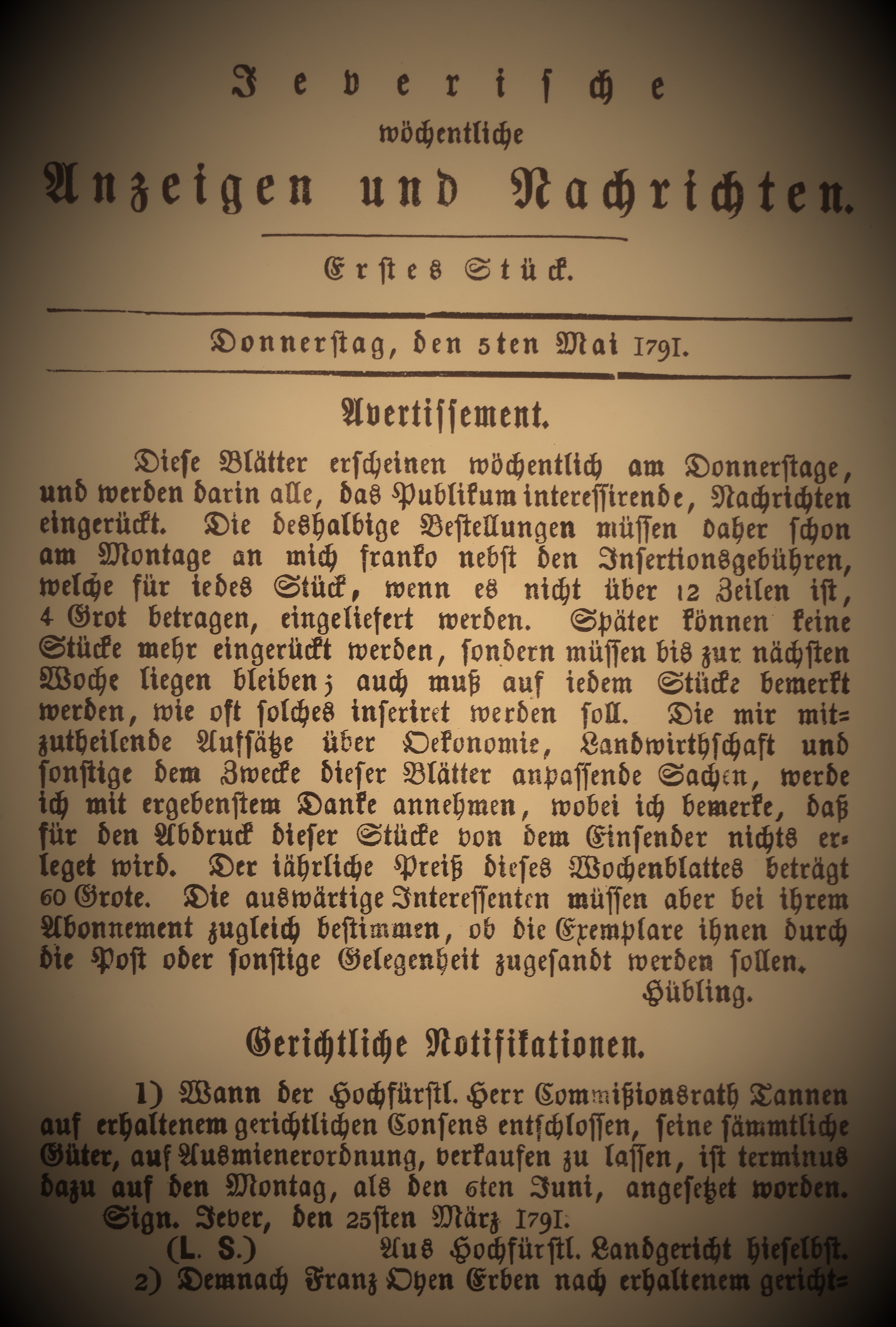 Erstausgabe des Jeverschen Wochenblatts vom 5. Mai 1791. Foto: Helmut Burlager