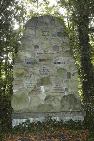 Schrifttafeln aus der am 9. November 1938 zerstörten jeverschen Synagoge, eingemauert in einen Gedenkstein auf dem Friedhof in Schenum.