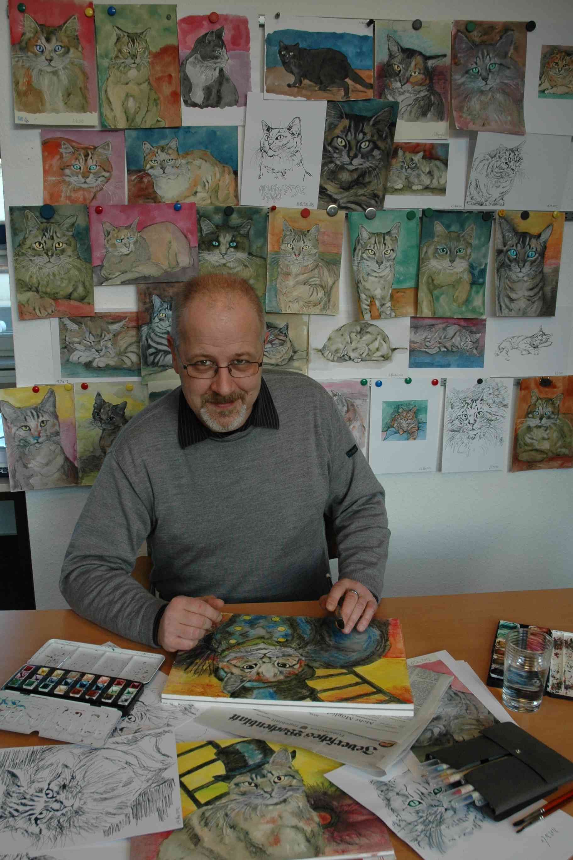 Wirklich Großes schafft nur, wer ein bisschen verrückt ist. So verrückt zum Beispiel, trotz eines stressigen, den Tag ausfüllenden Berufes jeden Morgen um fünf Uhr aufzustehen, um eine Katze zu malen. 365 Tage im Jahr, fünf Jahre lang, eine Katze nach der anderen, eine schöner als die andere. Und zwar erst einmal nur für sich selbst. Erst als Christoph Hinz, um den es hier geht, eine gewisse Übung darin hatte, zeigte er das eine oder andere Bild her. Die Zeitung – seine Zeitung, das Jeversche Wochenblatt, bei der er als Redakteur arbeitet – schrieb zweimal darüber, doch darüber hinaus hat der Katzenmaler nie eines seiner Werke publiziert oder ausgestellt. Erst nach Abschluss dieser Schaffensphase und nach beträchtlichem Drängen anderer ist das jetzt passiert. Seit wenigen Wochen ist er im Verkauf, der immerwährende Wandkalender für Katzenliebhaber: „Katzen Zeit“.