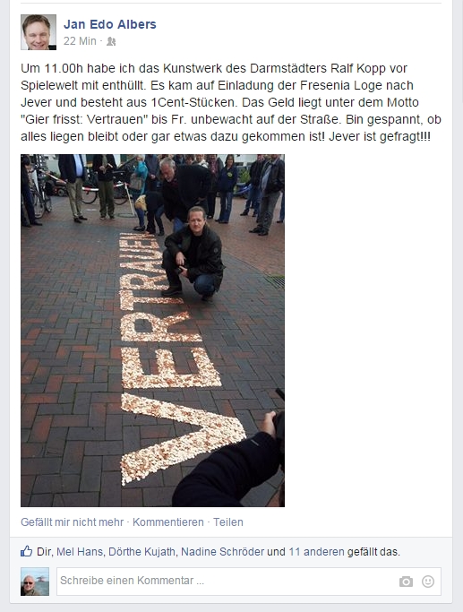 Nach einer Stunde hatte sich die Summe bereits deutlich erhöht, denn viele Eröffnungsgäste der Kunstaktion der Fresenia-Loge zu Jever und des Künstlers Ralf Kopp aus Darmstadt legten größere Münzen dazu oder tauschten sie gegen die blanken Cent-Stücke. Aber was, wenn keine Zuschauer mehr herumstehen, siegt dann die Gier über das Vertrauen? Eine Videokamera wird das dokumentieren, ohne potenzielle Diebe bloßzustellen. Eine Woche lang soll das Geld auf dem Marktplatz liegen – wenn es denn nicht vorher weg ist. Die Fresenia Loge ist zuversichtlich, dass Jever sich als ehrliche Stadt erweist.